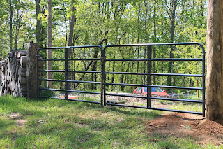 The sky's here are gray, full and rain off and on. But the work never stops. 2 gates are up and a shade hut is made / all be temporary but will keep Navarre from getting too hot if necessary... It is not what I want for long but to get the horses moved it is what I need.